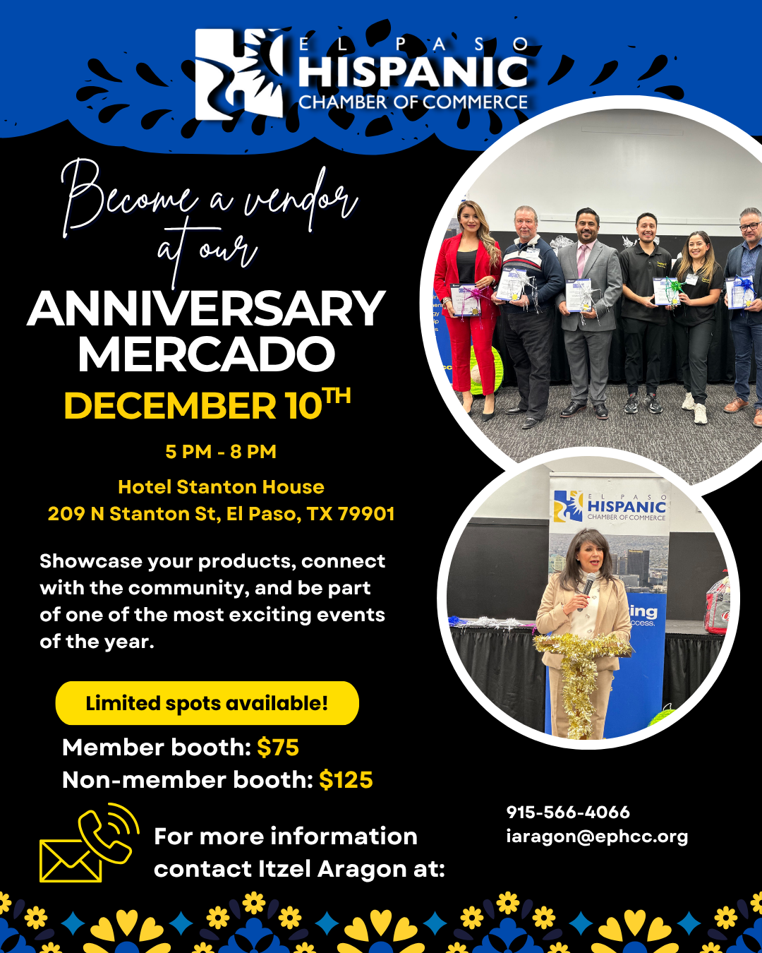 Join us for our Annual Mercado Celebration! This is your chance to showcase your products, connect with the community, and grow your business visibility with hundreds of attendees and meet our 2026 Board members.